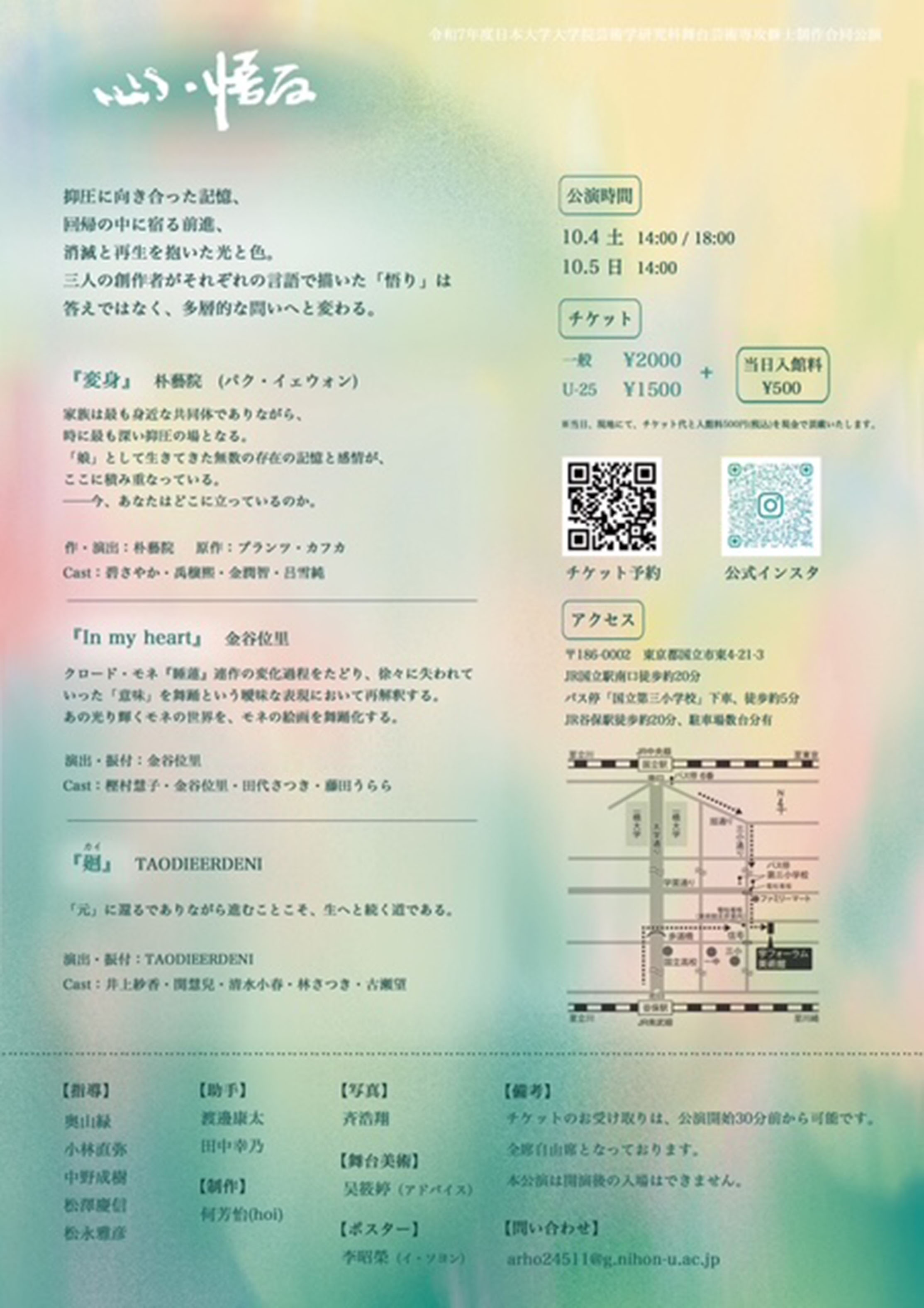 - ● 10月4日(土)~5日(日) 「心・悟る」 日本大学大学院芸術学研究科舞台美術専攻修士制作合同公演