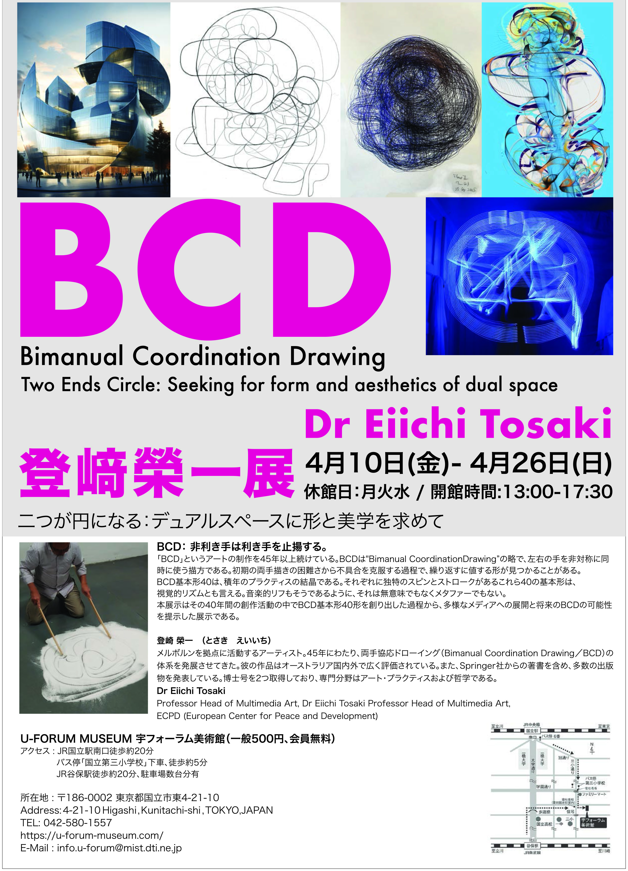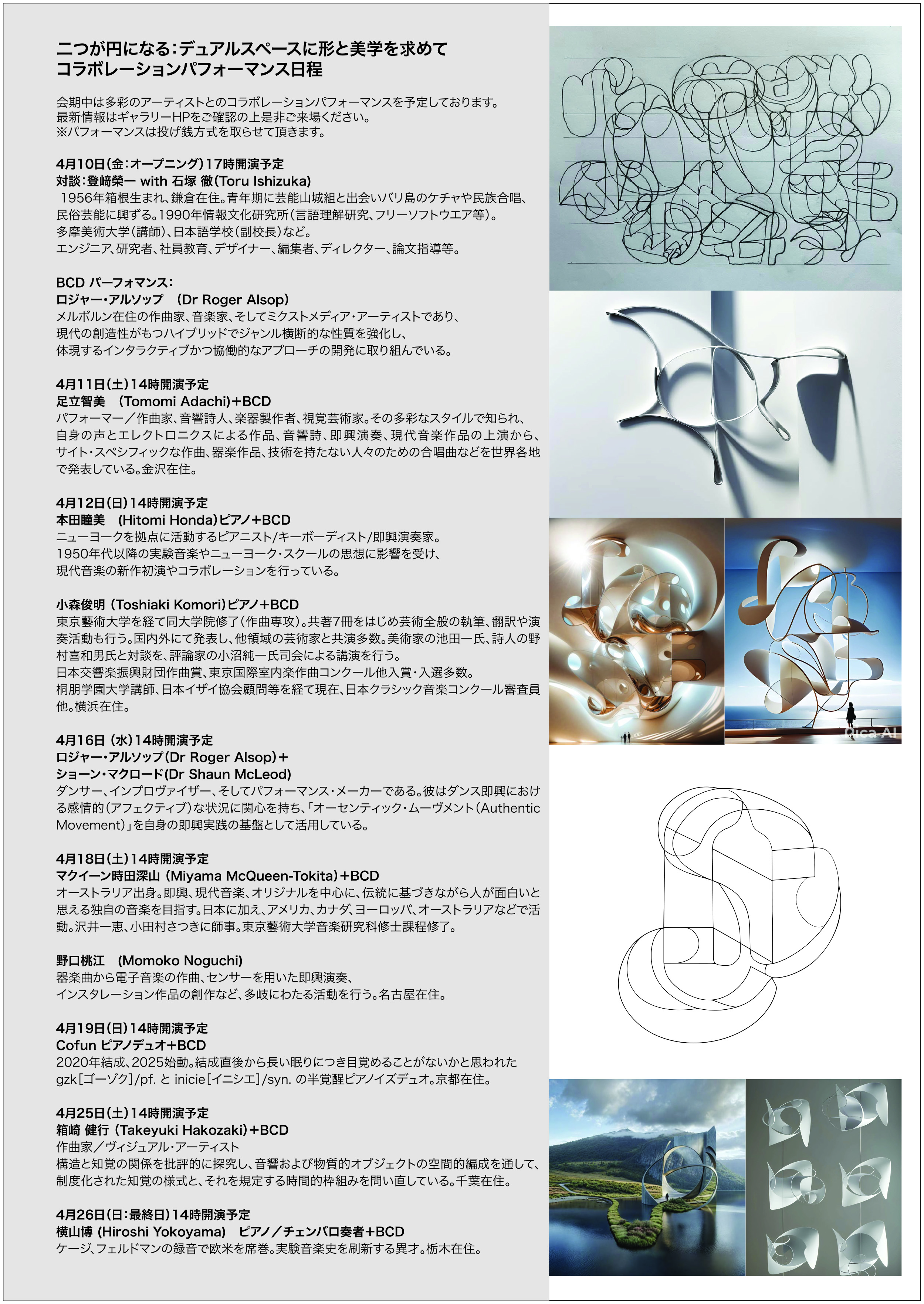 登﨑榮一「BCD(Bimanual Coordination Drawing)というアートの制作を40年以上続けている。両手でしか描けない基本形を40つくった。その基本形と筆順を頭と手に叩き込んだ上で、左右非対称の形を重ねたり結合したりして描き紡んでいく。美的直感から形のフローを作るのだが、リフを中心に編んでいく過程はジャズのインプロに近いかもしれない。左右手の差異をそのままに、リズム的コンポジションを探していく過程といってもいい。その抽象的形は時に彫刻に、AIの助けを得て建築的にもなる。」