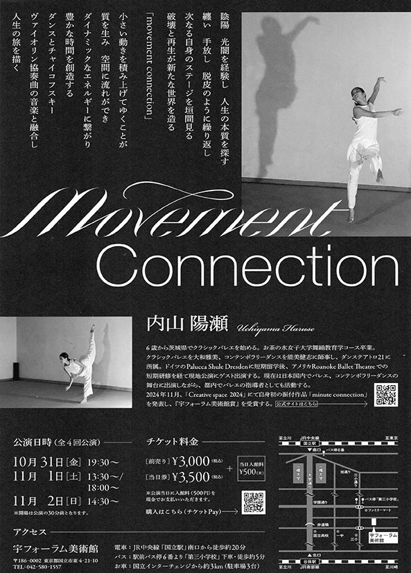 「Movement Connection」 ・昨年の現代舞踊協会提携のcreative spaceにおいて宇フォーラム美術館賞を受賞された内山陽瀬さんの公演です。