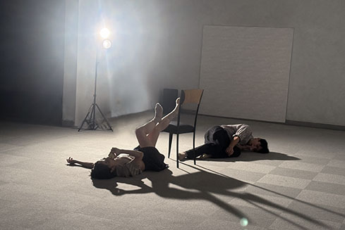 丸い金属のスツールイスの上でくねくねとポーズをとる。少し倦怠的な曲。二人で組み合うようにして戯れる。かくかくと首を曲げたり、腕をふりまわす切れのいい動き。壁の影もきれいだ。チェロの無伴奏バッハ組曲が流れ、それに合わせて踊るような動き。井上陽水のダンスはうまく踊れないという曲はあえて、ダンスというより動きを追求することによる選曲だろうか。演者二人は倦怠的な曲が流れる中、組み合うようにダンスを踊る。この二人の関係性「狭間」を表したのか。
