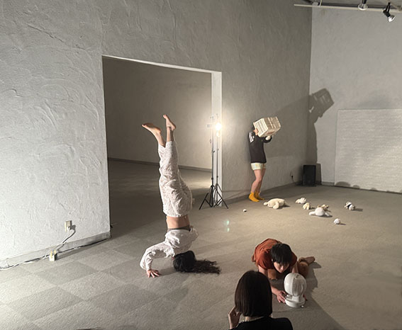 三人三様の演技。両方の部屋で音楽なしではじまる。前半は奥で一人が踊り、さらにとうとつに昭和の懐メロのイメージの女性の歌謡曲が流れる。手前の部屋にはプラスチックの買い物籠を持ってじっと立っている白地に小さい赤玉のパジャマと、茶色の服を着て横たわる二人の若い女性。後半は買い物籠に入ったぬいぐるみをぶちまけ、拾う動作を繰り返す。必死に組み合い、表情も変えず無表情な人に何度も振り払われる。明るいネバーエンディングストーリーの音楽が流れる中で繰り広げられる。三人の関係性が一向に見えない中で繰り返し行われる行為はまるで不条理の悪夢のようだ。床に置かれた小さなレトロのラジオから、高市首相の憲法改正が必要という国会演説と、続いて日本の株が2000円暴落したというニュースが流れ、もしかしたら政治的なメッセージか?とも思う。世の中の様々な社会と、それらと同時並行しながら隔絶し、混沌とした個人の生活を表現したのかと感じた。