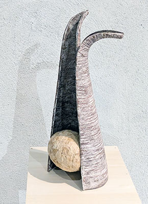 2、 壁に沿って10の作品が展示された。それぞれ樹皮布を使ったシリーズだが、さらに鉛シートを使い、円錐形から、何やら絡み合った立体の知恵の輪のようなものなど様々だが、いずれも抽象的な形態。人を笑顔にするように柔らかく、少しユーモラス。さらに最後の作品の台の下部にもう一つの作品というアイデアが斬新。