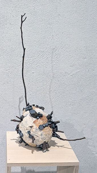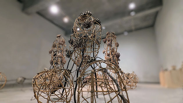 ともあれ、作者が布から三角錐の小さな棘を生成させ、それを集めて実となし、実を繋げて小空間を作り、さらに桑の枝で連携させる……その生成過程こそ、植物のさらには動物、そして人間の個と集団の問題を見事に投影させ得る立体アートに創り上げていると感嘆する。哺乳類の多くは四つ足、そして人間は直立二足歩行。一方この不思議なトゲトゲの実は三本足なんだ……とも。