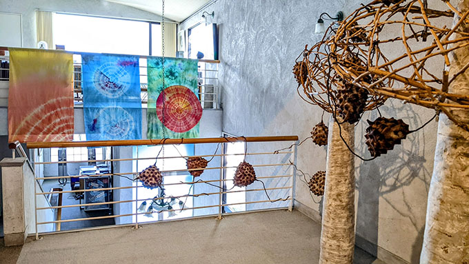 (「記憶のかけらたち」は吹き抜け部に展示された手すりの表と裏からも見らることができる大きな3枚の作品で新作。4つの作品はさらに様々な作品の集合。題名はかつて聞いた音楽にインスパイアされたもの。絞りや板染めによってできた光輝く万華鏡のようであり花の花弁のようでもある。それはまた作者が無類の花好きと関係しているのだろう。)