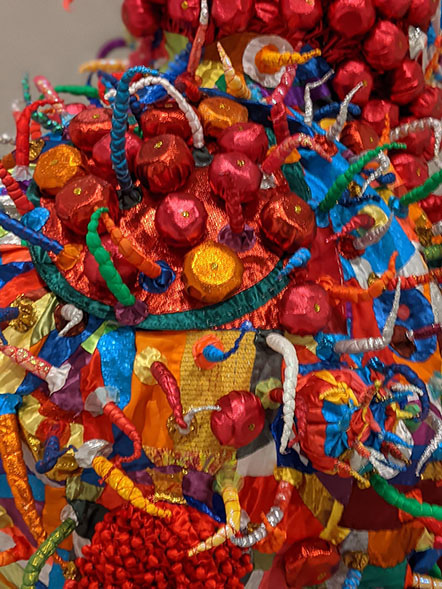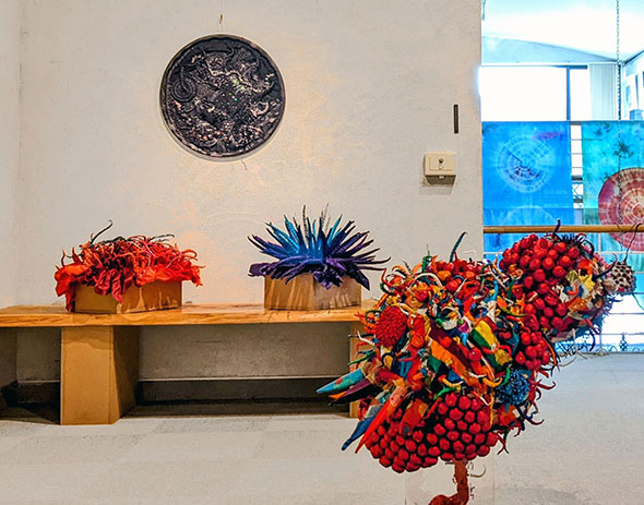 (赤、金、銀、メタリック調の布を駆使した立体オブジェ。「過ぎ去りしもの」は小惑星イトカワよりインスピレーションを受けたという。この惑星は二つの塊がくっついている形をしていて楕円軌道で回っている。他の作品はイソギンチャクやオニヒトデのようにも見える。生物のようでもあり無機物のようでもある。様々なメタリックな布による突起でキラキラと輝く様子は怪しげで、かつ生きているような生命感を感じさせる。)