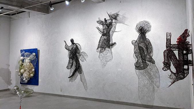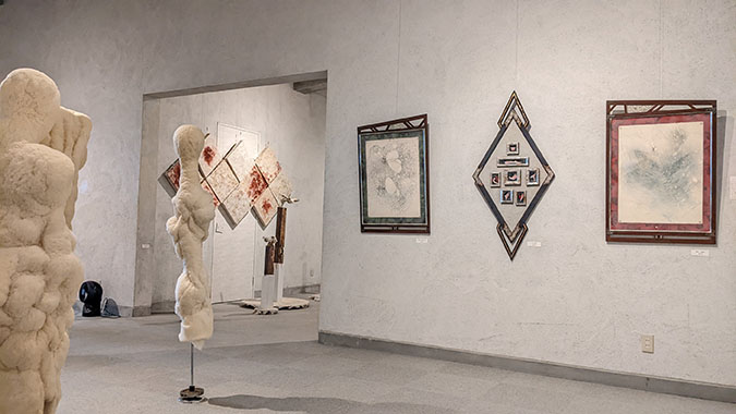 『「あわい」の中で」「実体と影、表と裏が一体となった作品をつくっています。今、私たちを取り巻く世界で、夢や現実・希望や未来・暴力や恐怖・心に潜む不安感など、一つの方向を見つけ出すことが難しい日々が多くなっています。その中で、今の自分の心の立ち位置を確認してみてほしい・揺れる思いの中、今日一日の夢や希望・未来の在り方についての方向を見つけ出してもらえたら。そんな思いで4点の作品を出品します。』