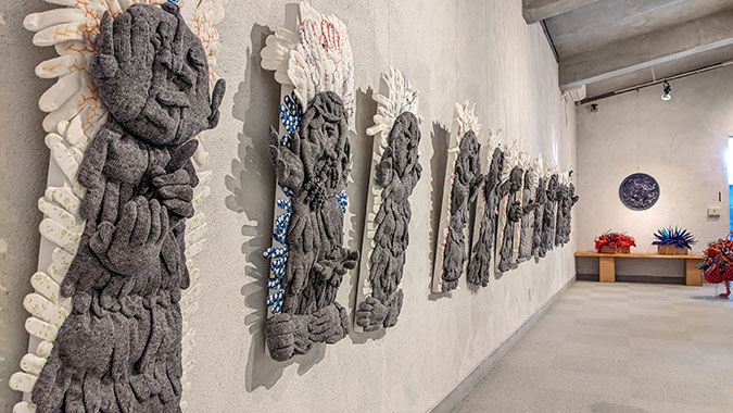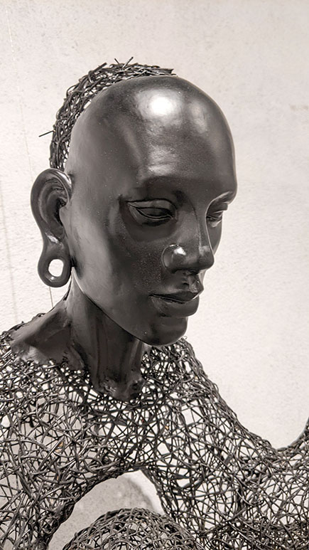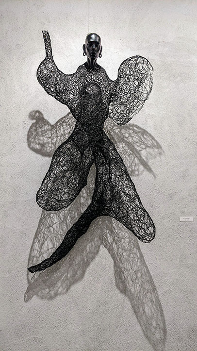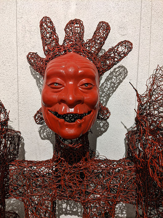 (赤茶や黒のマスクをかぶった不思議な網の作品が空を舞っているように高く飾られ、それらが壁に影を落としている様は圧巻。一見ワイヤーに見える細い藤を組み合わせて造形させ、漆で接着し、塗っている。日本の漆工ということになるのだろうがユニークだ。一転してよく見ると黒色のアフリカンのマスクはまるで広隆寺の弥勒菩薩のような静謐な表情。「人に棲む」の赤茶色のマスクは能面のようだ。