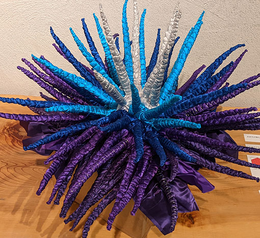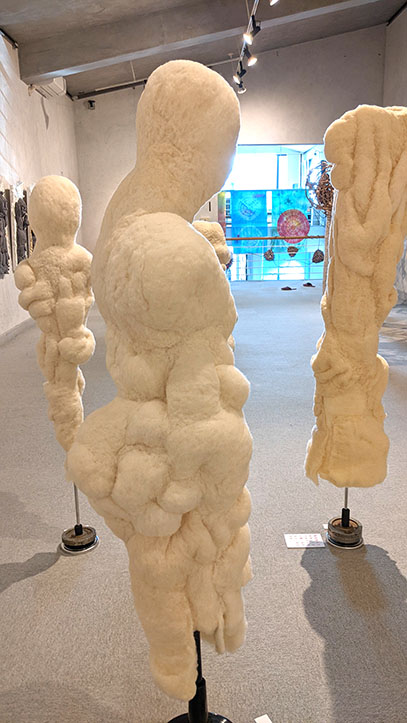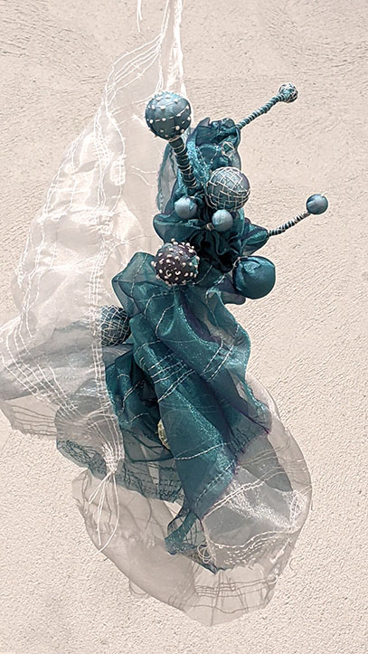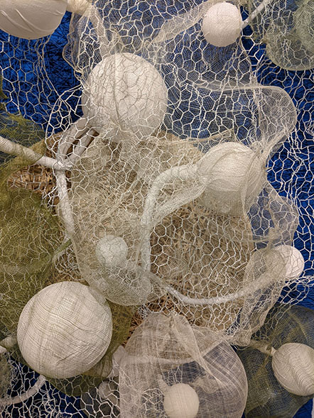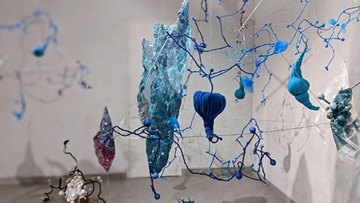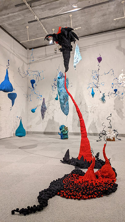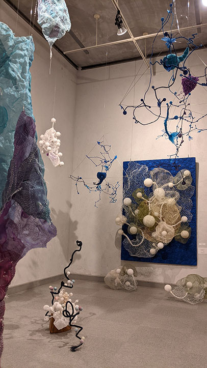 (天井からたくさんの作品が吊り下げられ、床に置いたサーキュレーターの風でユラユラ揺れる軽やかなモビール作品群となっている。題名の変形菌とは、キノコやカビのように「子実体」で胞子を作って繁殖し、大型アメーバ状の変形体となる生き物のこと。世界の生き物には不思議な形をしたものがたくさんある。さらに今回の作品は有機物の分子模型のようでもある。そして作品のブルーはマットで地球を表している。それらの中に包まれる体験は忘れられない。気の遠くなるようなステッチの作業から生まれた壮大な作品群は作者の強い想いを感じさせる。