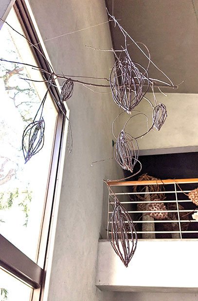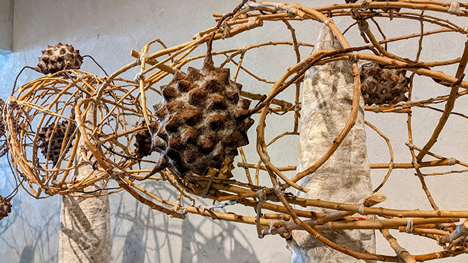 (会場の入口に置かれた作品に皆驚く。サバンナに屹立するバオバウの木のような不思議な物体に凸凹の不思議な塊。一見すると自然物のドリアンかと思われるが作られたと知り、どうやって作ったのかと作者に質問。延々と答える矢野さんは常に笑顔だ。塊は寄生し作品や建物の手すりに絡まり、さらに横に広がりまさに空中散歩しているかのよう。なぜこんなアイデアが生まれたのだろうか。)