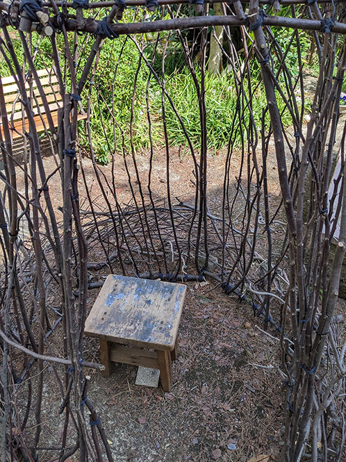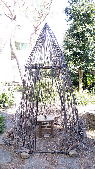 『風が強く吹いた次の日、たくさんの欅の枯れ枝が地面に落ちています。それらの枯れ枝を使っても鳥の巣のようなものを作りました。どうぞ中に入ってください。ヒナになった気持ちになれるかもしれません。」「みのむし」「欅の枝の端っこは、とても細いので軽く熱すると、自在に曲げることが出来ます。曲げた枝を組み合わせて遊んでいたら段々、蓑虫に見えてきました。』