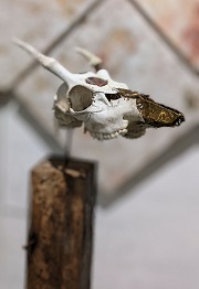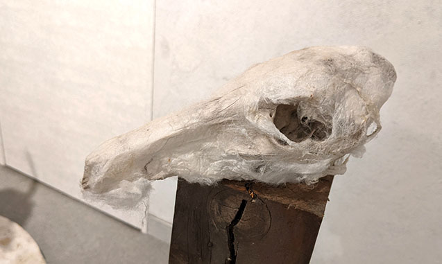 (Patch dynamicsとは、生態系の構造、機能、およびダイナミクスが、それらの相互作用パッチを研究することによって理解できるという生態学的視点。ここに展示された動物の頭蓋骨。三つは鹿で一つはイノシシ。頭蓋骨になぜか金属や金箔が施されていて、金継ぎされた美術品のたたずまい。茶色はベンガラだが、血のようにも見える。動物たちは死んでも生命の痕跡は残り、種として命は続いていく。)