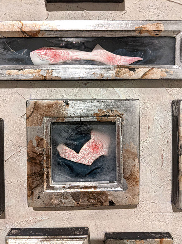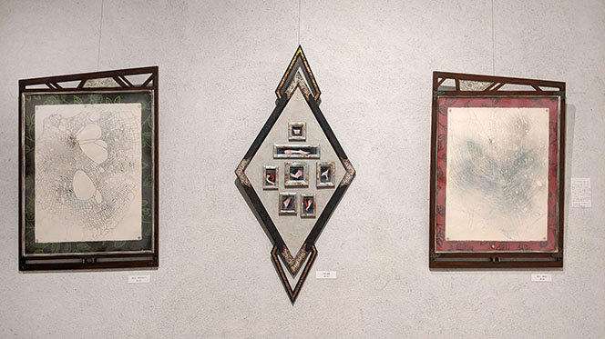 (クモの巣に魅せられた作者は自宅の庭で採取したクモの巣で作品を作り続ける。額も自作するが、並んだ3つの額は総体で左右対称。さらにその微細な金属加工はかつての江戸や明治時代の金工技術を彷彿とさせる。8年前の展示では飾られた宝石のようなクモのミニチュア(過去のネットで見られます。)を思い出した。この額縁も含めて見ごたえのある作品となっている。