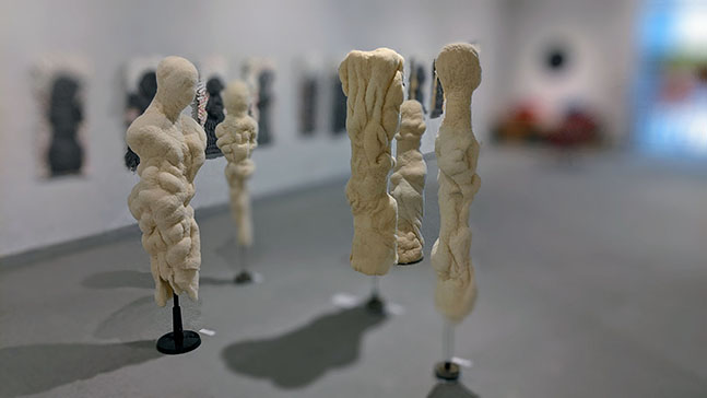 (羊毛のようなソフトな素材の物体をニードルで刺してへこませたシュールな造形。作者の「想い」は不明だがコメントは少し怖い。作品に宿る「想い」はともかく作品を遠目で見ると季節柄目につく桜の老木の太い幹のような、あるいはジョルジョ・デ・キリコのマネキンのような不思議な作品でユニークだ。)