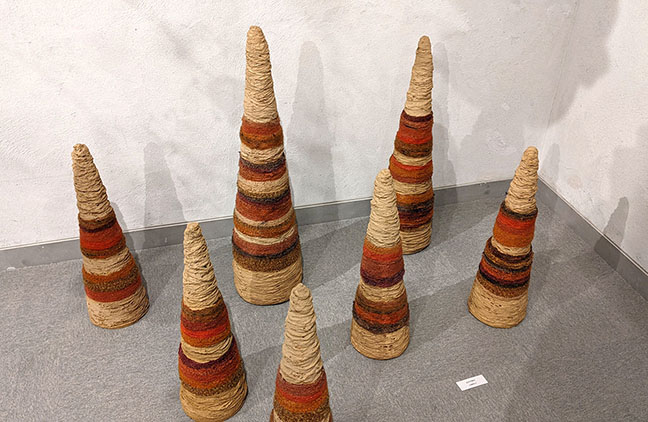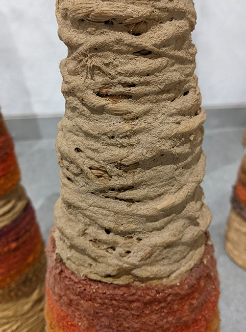『朽ち果てた杜に現れた白い予兆- それは再生を希求するエネルギーの現れでしょうか。』(素材: 麻紐、金網、シマナイ生地、晒、木粘、アクリルメディウム、木粘度、スチロール他) 「古代竹群生」『人知れず産土(うぶすな)に生い立つ古代竹はやがて群生となって大地を癒すのです。』(素材: