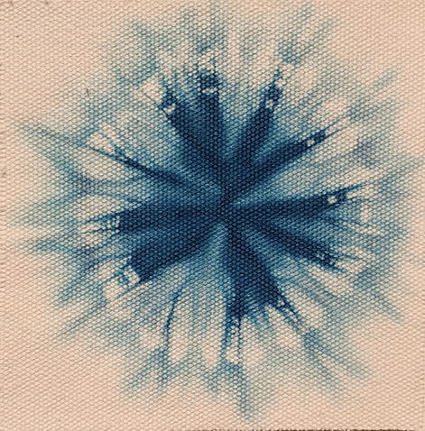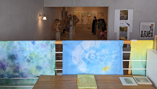 『小さな四角の帆布を、絞ったり、板で締めたり、色を重ねたり、抜いたりして、一枚一枚染め、キャンバスに張って作品を作っています。偶然生まれた色と形の集まりが、ふと遠い日々の出来事、風やにおい、空気感をよみがえらせてくれ、なつかしさに包まれる瞬間があります。そんな記憶のかけらたちを、小さな布に写し取れたらと思いつつ・・・。』