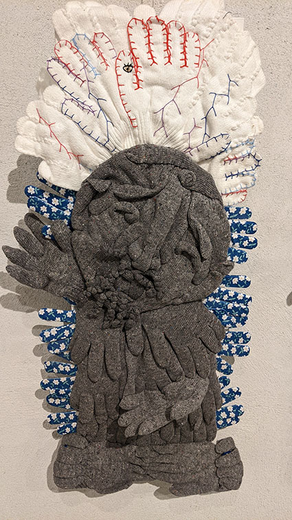 『人の手にはめ裏方作業をしてくれている再生軍手や園芸手袋を表舞台に。作品は羅漢様の他、後光にも何か・・・。楽しんでみてください。』