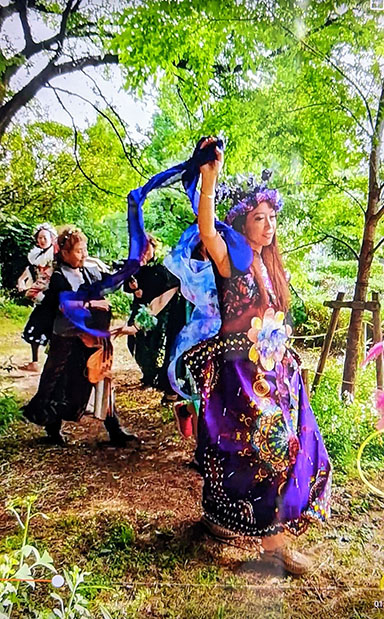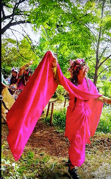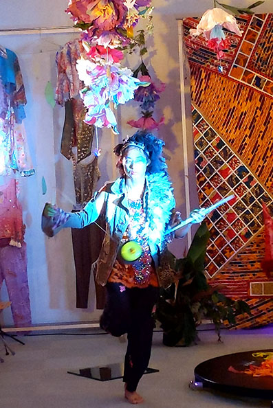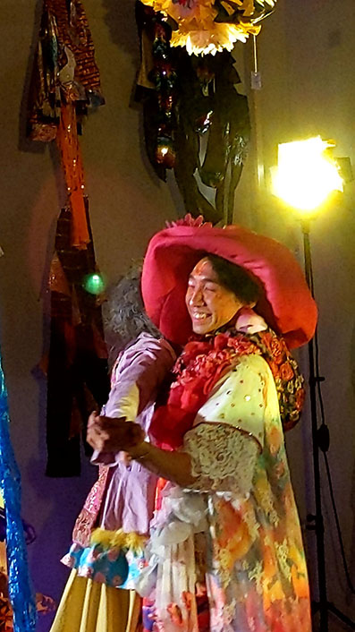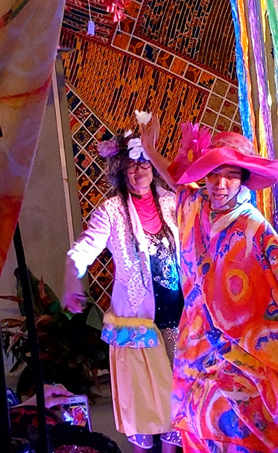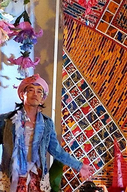今回のクロージングパーティーで行われた「キセキの銀河」には子息の夢以(ムイ)さん、妻のジョーさんが音楽(CD)で参加している。アーチストの夢以さんは海外で活動していて、今回、本人はフランスにいるため参加していないが、彼の大胆でカラフルな花の絵をプリントした巨大な絵画布が飾られている。また今回は造形作家である矢野理恵さんの植物系の大きなオブジェが会場入口に展示され、そのオブジェも独特の帽子とマッチしている。