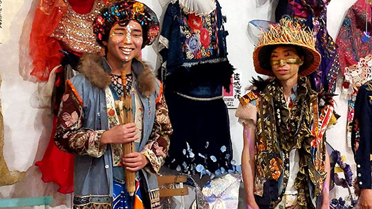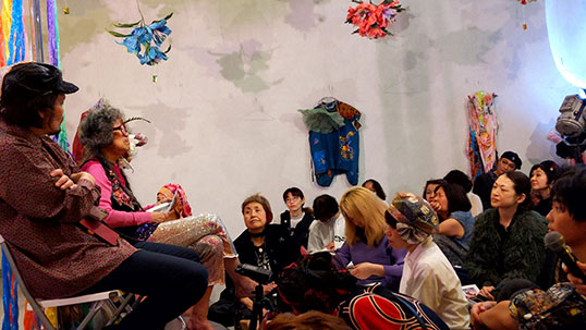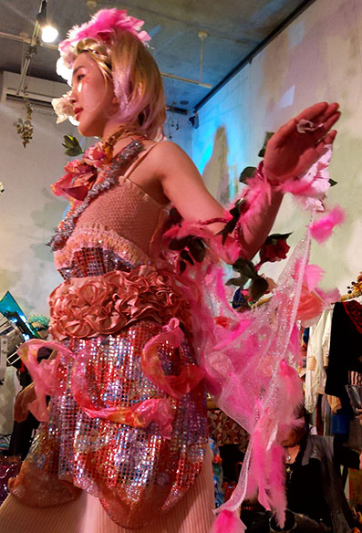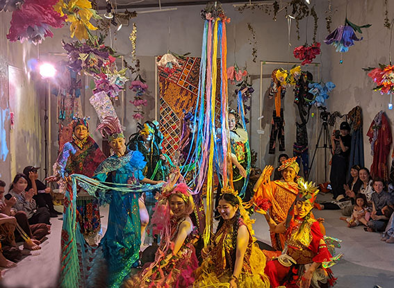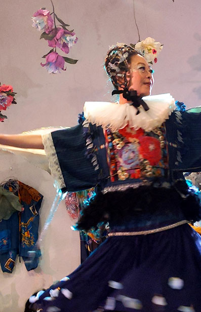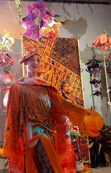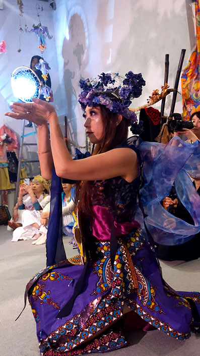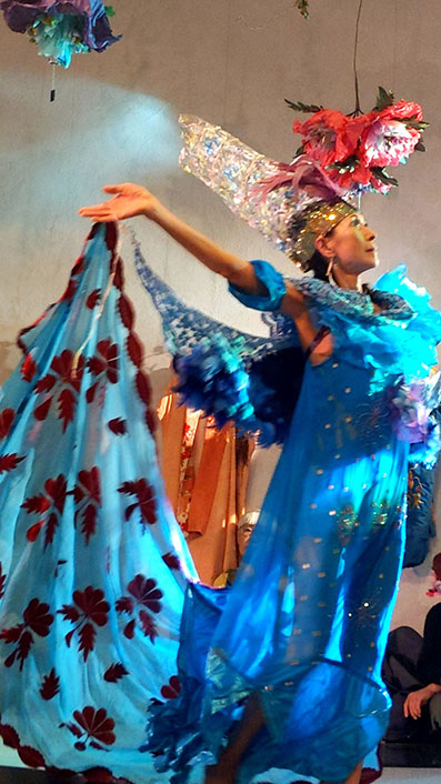 オープニングパーティーは、ルウさんの衣装をまとった人たちによるファッションショー「花と少年」。少年(中年、老年?)によるパフォーマンスだ。音楽も手が込んでいて、気鋭の二十五絃箏奏者の佐藤康子さんによる熱演が注目された。クロージングパーティーはカナダの作家Della