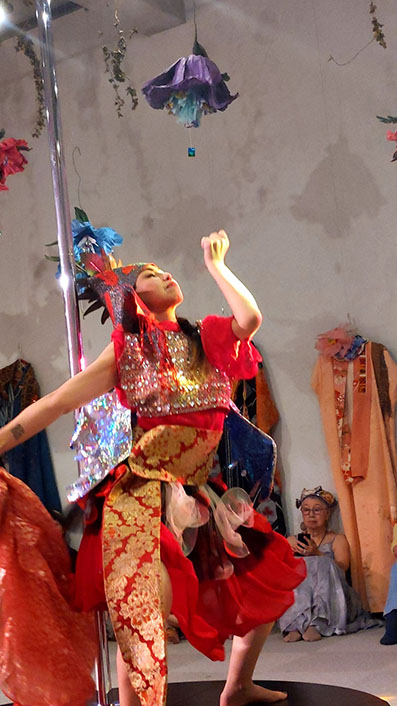 今回、天井からたくさんの夢以さんのカラフルな絵画布が吊り下がり、たくさんのマネキンが並ぶ。飾られたマネキンは京都の三十三間堂の仏像のようにひしめき合っている。絵画布はまるで仏教寺院の荘厳とよばれる金銀の飾りを彷彿とさせる。かつての仏像も煌びやかだったに違いない。そして流れる抑揚のない音楽は僧の唱える声明のよう。寺院内部の空間に響く読経の中で人々は現世を忘れ、陶然としながら精神をトリップさせる。さらに妄想を広げれば、タルチョーと呼ばれるチベット経の五色の祈祷旗を思わせるポールダンスのポールの布。天使と呼ばれる踊り子とたちは菩薩か観音様か。チベット経によれば、極楽では7色の光が降り注ぎ、大きな音がして人々は救済されるという。それはヨーロッパのキリスト教と混交した全く新たなインターナショナルというか無国籍の宗教か。ルウさんは愛と平和を説く司祭であり、参加者たちはその信者なのだ。