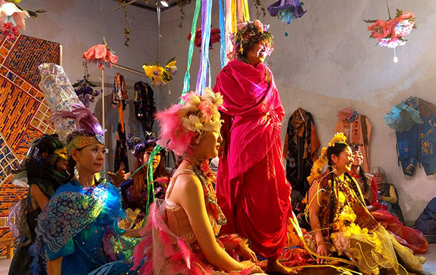Burfordの「マジカルレインボー」を原作とする八つの天使の物語。今回は新たに中央にポールダンスの舞台が設置され、当館でもおなじみのサワさんが仮面をかぶり緑の衣装でアクロバティックなポールダンスをされ、恒例の「Hikariasobi」によるミラーボール的な照明も効果的。八つの天使もそれぞれユニークな衣装に身を包み会場は盛り上がる。最後は、参加者が大学通りでパレード。ラウンジだけでなく屋外には餅つきやピザ窯のピザ屋まで出現して出店も充実。ピザ窯で焼かれたピザはビーガン仕様という「愛」のこだわり。