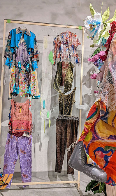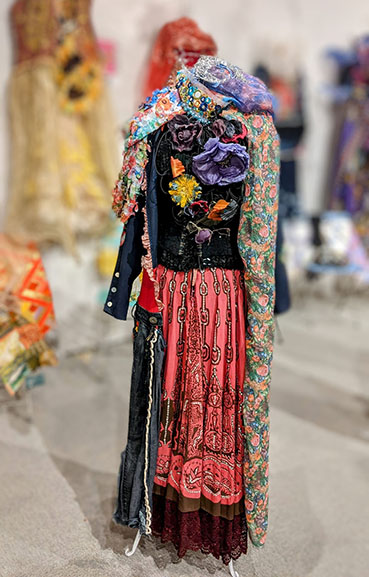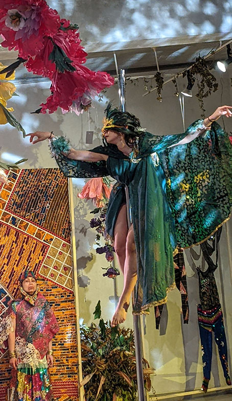 ルウさんの企画展は今回で3回目であり、帽子展、ファッションショーさらに音楽、踊り、舞台もあるきわめてエンターテインメントなもので毎回熱心なファンが訪れる。美術館でのファッションショーはメトロポリタンミュージアムでも行われているが2018年に始めた当館の方が早い。ルウさんの衣装は一言で煌びやかで、造花など植物的な模様も取り入れられている。ステージ衣装としても画期的であり、身にまとうアートでもある。一方、ルウさんにとってこのイベントはむしろカーニバル。最後にはサンバのように町に出る。ブラジルのサンバの衣装は当地で「ファンタジア」と呼ばれ、当地のサンバを見たルウさんはイベントを考える人である「カンナパリスト」になりたいと思ったという。そしてそれを実現した。しかしひとりでできることではなく、多くの賛同者が必要だ。会場内には様々な植栽、花や、アートな造花が飾られているが、当会会員の軽部弘子さんと齋藤薫さんもフラワーアレンジメントで参加。数えると当会の会員が5名も参加していた。