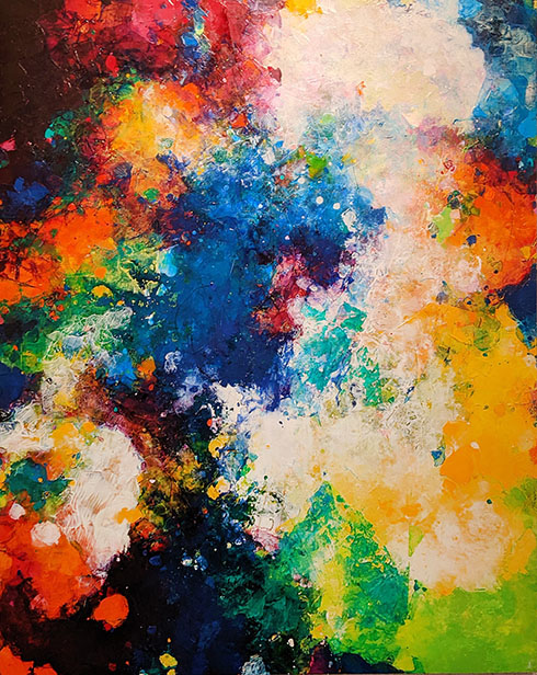・桐 健二/ 作者の想いを伝えるような原色の激しい色使いの油絵。ペインティングナイフ、ドロッピング等による強い表現が特徴。作者のいう「積層」がよくわかる様々な部分が面白い。「speed