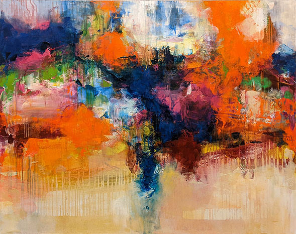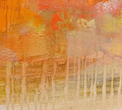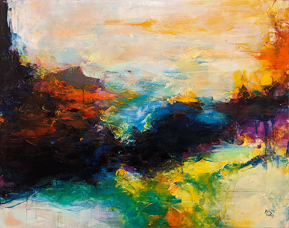 あたたかく包み込んでくれるような風景。風景は表層を視覚でとらえますが、目には直接見えない部分も含めた厚みのあるものとして私たちのイメージを刺激します。私は作品を、綿布にアクリル絵の具を塗り重ね、それを削っていき下の層を出していく方法で制作しています。作品の表層に現れた風景と、喚起されたイメージを感じて、私の絵を見る前より少しでも、爽やかで晴れた気持ちになってもらえたら幸いです。