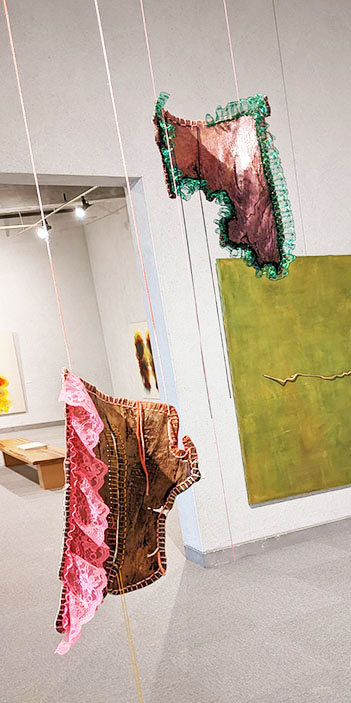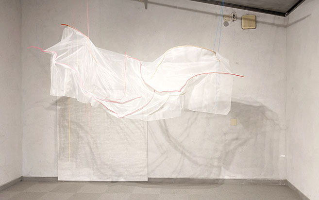 は約3m弱の空中に軽々と浮かんだオブジェだが薄くて光を通すレース状の布にピンク色やクリーム色の細い小枝が縫われている。吊る糸も赤、緑の糸。裏からも光が透けてきれいだが、さらに壁にそのオブジェの影も美しい。NuuⅡは幅3.7mの大きな和紙に木の戸板の木目が2枚、拓本のように摺られ、それを繋ぐように細い木片がメタリックな金糸、銀糸等で縫われている。NuuⅢは100号のややメタリックな複雑な緑色に塗られた下地キャンバスに細い木の枝が縫われている。NuuⅣは天井から木の幹の表皮が二点、糸で吊られている。表皮にはピンク色、緑色のレースなどが縫われている。木を縫うという柳氏の挑戦が続く。