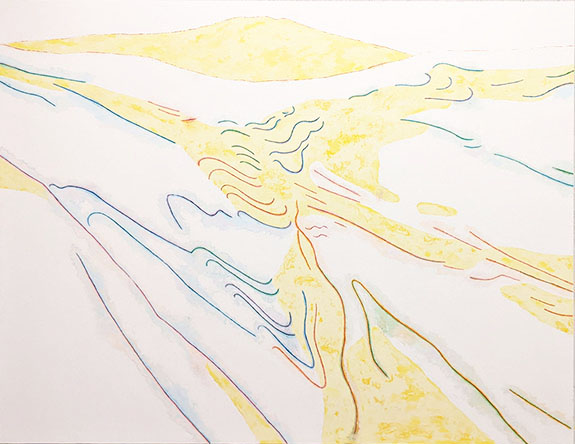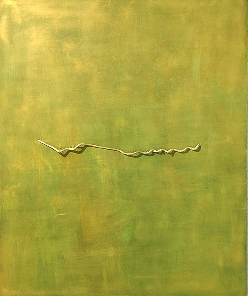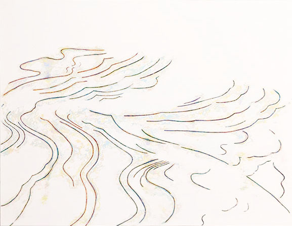 ・田中 宏美/ 一見すると白いキャンバスにパステルカラーで線が引かれているだけに見える。しかしよく見ると下地の白の絵の具の下には実は何層も下地の色が重ねられ、その表面をサンダーで削ることにより微妙で繊細な無数の色が現れていることがわかる。線を描いているのではなく削ることにより線と色が生まれる。題名の「KAZE」であるが、見えない風の絵は少ない。しかし花鳥風月では風の言葉がある。風は単なる風ではなく、モノが生きていて移り変わることの表現なのだろう。