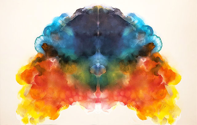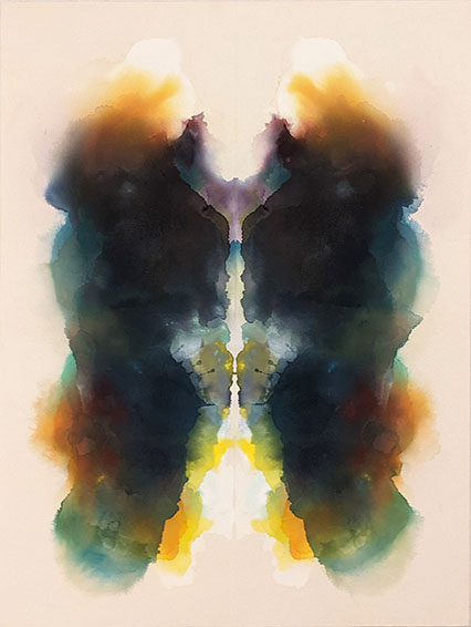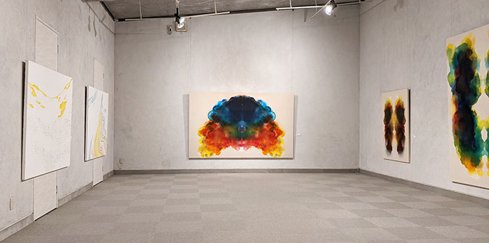 ・笠原 宏隆/ まず左右対称の構図が目に入る。これは二つの画面を合わせて色を付けているからだ。さらに色彩が際立ってきれい。よく見ると下地の帆布に絵具が染みている。カラフルな絵具は、単にキャンバスに塗られているのではなく染みることで濃淡の微妙なグラデーションが現れている。1960年代にアメリカでアクリル絵具が生まれた時、ニューヨークのモリス・ルイスやポールジェンキンスなどの作家たちが帆布にそれらをシミさせてシミ派と呼ばれた。それは水墨画の「たらしこみ」を思わせるが、カラフルなシミをしたのは、宗達や光琳ら琳派の草花図等が始まりだった。日本人でアクリル絵具によるシミ派的表現をしたのは当時ニューヨークにいた平松輝子だった。いずれにしろこの表現は極めて美しいので、もっと多くの人がシミ派の表現に注目してほしい。