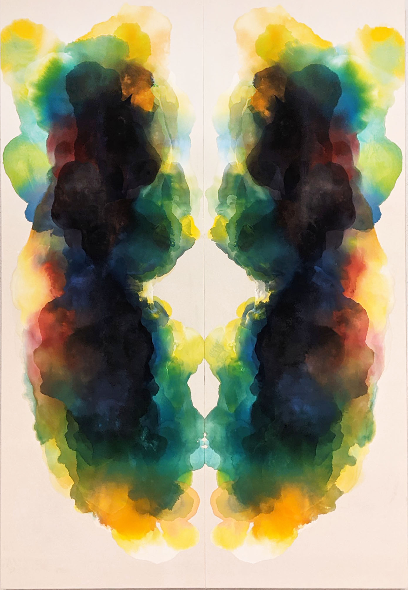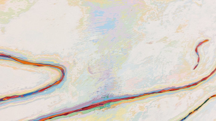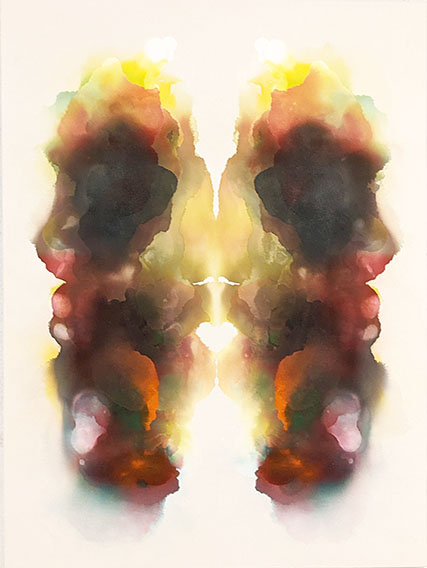 Statement 《エラン•ヴィタール 生命の飛躍》 画面の片方にだけ絵の具を垂らす。そして画面を半分に折り曲げて、もう片方の画面へとそれを転写させる。これを繰り返す。幾度となく重なり合った色や形は層を作り始める。初めの頃ははっきりとしていた色や形は、重なるにつれ曖昧になり、やがて一つの塊としての流れを形成し始める。この一連の行為は、生命の成長の過程にとてもよく似ている。一つの核となる細胞が幾度となく分裂を繰り返し、やがて形のある生命を完成させる。《エラン•ヴィタール》生命の飛躍とは、一つの差異から始まる反復運動の過程の間に存在し、意識の内側に予め組み込まれている進化の為のプログラムのようなものである。生命は意識の中で直感的に行うことで、この大きな宇宙の一部として共存し、この先またいずれ必ず訪れるであろう差異の始まりへと向かうまで、生命の進化という像《イマージュ》を思い描き続けるであろう。