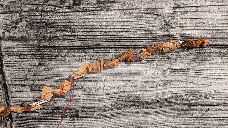 Statement 木を紐で縫うことで、時の繋がりや世代を超えて受け継がれることを表現している。パリで木に出会い素材の面白さに魅了され、木での作品制作を始める。桜、柿、銀杏、樟、ケヤキ、松、檜など自身の周辺で手に入った木を再生させるように縫い続けている。現在は「Au