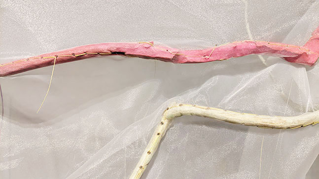 ・柳 早苗/ 作者は彫刻の作家だが、今回、平面的な作品表現に挑んだという。全体としてのテーマは「縫う」。趣旨は作者のコメントにあるが、縫う行為を問う謎かけのような作品であるが、何か虫のような有機物にも見える。まずNuu1