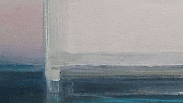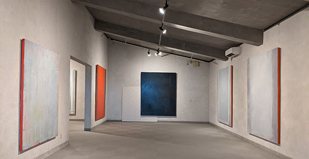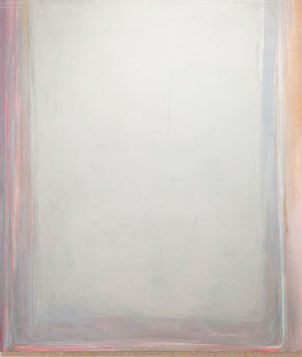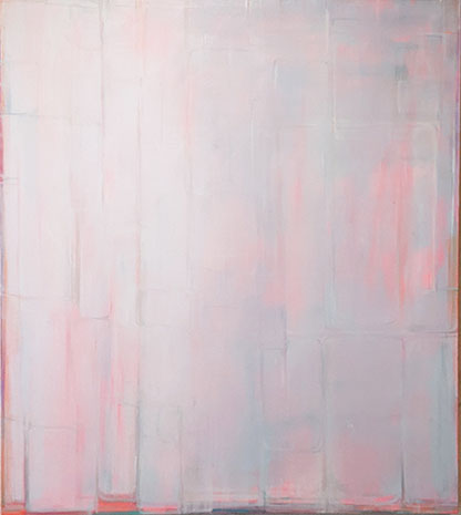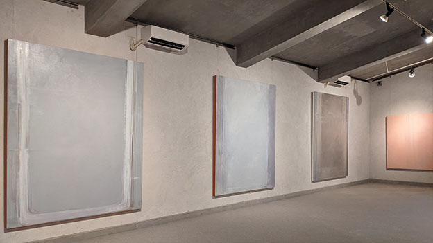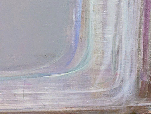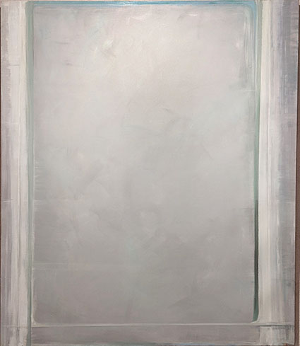 これらの作品はまさにカラーフィールドペインティングだ。鶴巻氏のイメージカラーであるグレー系が11点の他、赤と黒と淡いピンクが1点ずつ。グレーも明るい物からやや暗いものまで様々。地味であるグレーがテーマの画家はあまりいないが抽象絵画において色が重要であることはいうまでもない。F150が10点、F130が3点、F100が1点。油絵具にもかかわらず薄塗りということもあり下地の色がやや透けて見える。構図はシンプルで基本は縦線。作者の解説によると「最初は具象の人物像から始まり、それが鏡に映り、鏡が縦に割れて次に人物が消滅し、何もない縦線の空間が残った」のだという。この構図は、鶴巻氏独特のもの。見方によっては白地のカーテンを隔てて外の世界があるような解放感。あるいは昔のモノクロテレビのブラウン管の何も映っていない画面の色。何かがあるような、ないような。この展覧会に来られた観客はそれぞれ何を思い浮かべるのだろうか。