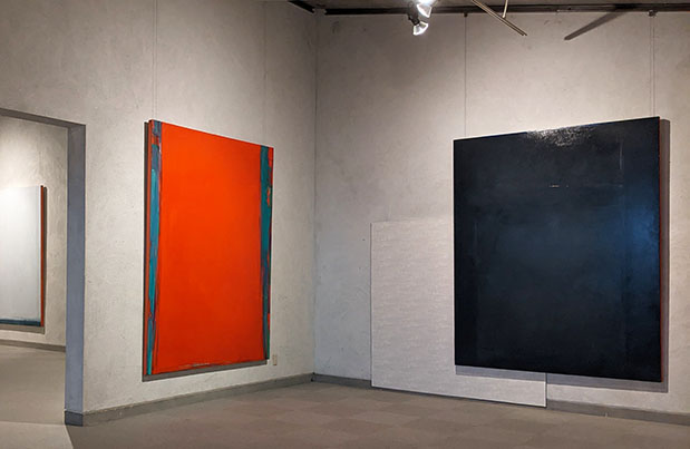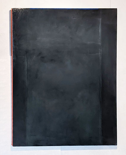 Work1、Work2は表面に薄く縦ラインの模様があり、透明感もある。奥の部屋の正面の一番明るいグレーのWork5は写真ではわかりづらいが微妙な光のニュアンス。Work9の赤の作品はビビッドなつやのある赤。これは元気のある時に描いたというが確かに見ると元気になる。ところが不思議なことにこの絵具の特性なのか斜めから見るとその赤はマットで少し薄くピンクがかって見える。Work10の黒の作品には様々の色が混ざっている。具体的には上部の2cmくらいは濃い青。しかし写真では判別できないだろう。この絵もやはり側面は朱色である。
