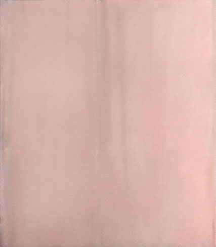 もう一つの特徴は絵の側面に朱色(正確には自分で調合したオリジナル)が塗られていること。この朱色はキャンバスの地色として塗られているようでそのためグレーは無機的ではな温かみがある。額はなく、キャンバスは木縁の裏で止められている。実際に、会場で観る時は正面以外でもその色が見えてしまう。だからその絵の印象はグレーと朱色。しかし正面から見ると朱色は見えず、作品のイメージもまったく異なる。グレーなのか、グレーと朱色なのか、この作品をどう評価するかが問題。横の部分も作品ということであればこれは平面作品ではなくなり立体作品となるのだが。