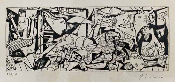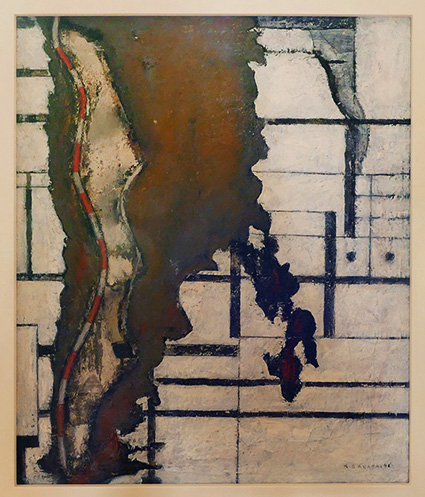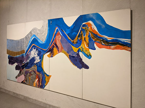 主な展示作品 ① ・二紀和太留(1921-1997)/戦艦榛名に乗艦。戦後戦友の鎮魂のレクイエム展を多数開く。・末松正樹(1908-1997)/昭和44年フランスパリにいてマルセイユからスペインに避難する途中で警察に捕虜として抑留される。・金光松美(1922-1992)/アメリカ生まれの日本人。1941年、人種差別よりカリフォルニアの収容所に抑留。志願兵としてヨーロッパに派遣。戦後はニューヨークでニューヨークスクールの一人として、後にロスアンゼルスで活躍。・ピカソ(1881-1973)/ドイツがスペインのゲルニカを爆撃したことに抗議し1937年、ゲルニカを発表。戦後、金光と出会う。・平松輝子(1921-2019)/2歳9ヶ月で関東大震災に遭遇。その時の体験を絵に描き、1966年にアメリカでデビュー。②特別展示 坂田一男(1889-1956)/パリでレジェの研究所で学び、1925年にパリで開かれ、ピカソも参加した「今日の芸術展」に東洋人として一人参加し国際画家として認知された。帰国すると抽象絵画を描き、日本の前衛美術の先駆者といわれる。平松、二紀の師である。