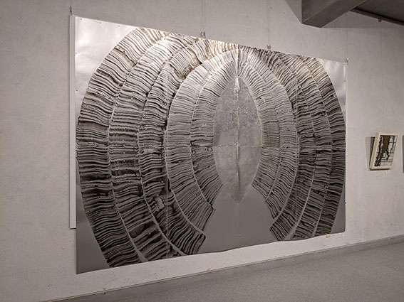 さらには幅広の銀紙の上に流水模様を墨で描き込んだ作品 ローマ時代の廃墟を墨で描いた大作……