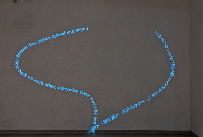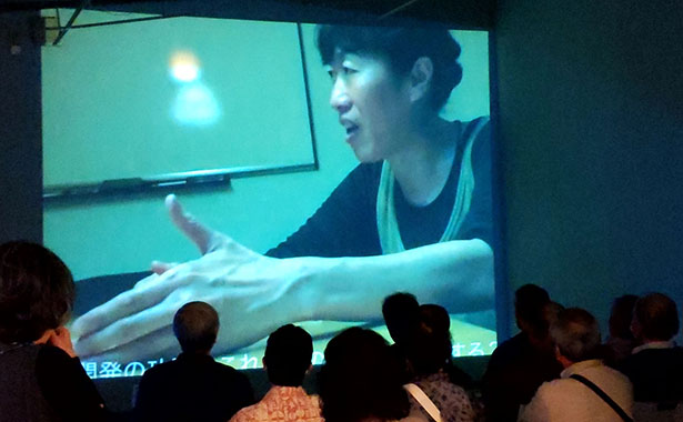 池田氏は、各国でパフォーマンスを行っている現代美術家。今回の「沈黙の呼吸」は偶然、2001年にマンハッタンの田中氏のところに、海外派遣芸術家制度で滞在していた時に遭遇した9.11同時多発テロについてのビデオ作品。事件の2か月後に、NY市民36人にマスクをしながら感想を語ってもらうというビデオパフォーマンスを行い、2017年に、彼らが語った言葉をビデオ映像化し、会場の壁に投影した。「恐怖、人類の恐ろしい過ち、無力」などの言葉が地面から立ち上り、地面に戻っていく映像作品だが、「”地”から出た言葉は、”地”へと還り、そして再び”地”から出でて”地”へと還ります。決して止むことはありません。同時多発テロから、いやそれ以前からの、今に続く、「人間の行為」の象徴として、未来永劫、反復を繰り返す」ことを示したもので、言葉のビデオ化及びデジタル化された画面の動きはユニークで秀逸。ある人は館内の床に座って、壁に投影された巨大なビデオ映像をずつと見ていた。最近、こうしたイメージのアート作品を見ることがあるが、当時は珍しかったと思う。