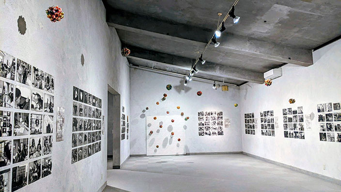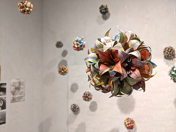 会場では写真と薬玉(くす玉)の展示をした。薬玉とは、古来の日本に伝わる厄除け的意味があり、今回は新コロナの収束を願うものでもある。写真は難民、原発事故、9.11、原爆開発(マンハッタンプロジェクト)などの社会的テーマと、平和と調和の未来プロジェクトとして薬玉の制作のワークショップを行った。ビデオでは、ソーシャルエディケーターとしての活動報告、及びアメリカにおける生活の紹介など多岐にわたる。特にコロナ禍でワクチン派と反ワクチン派の分断、さらに情報に対する疑義を提起されている。写真の総枚数はA4サイズ115枚に及び、それぞれ貴重な資料。田中氏の写真はテーマごとにまとめられていて一つの絵のように見える。絵画の原点は人に何かを伝える事。そうした意味では今回の写真展はまさに絵である。平和への祈りを込めた「薬玉(くす玉)」は、板締め絞り染めされた和紙ならではのカラフルなグラデーションができる。それはかつての日本が持っていた繊細な色と形の美意識に通じる立派なアート。世界の中の日本を感じることが本当のインターナショナル。具体的には正方形の紙を折っていき花ができるがそれをたくさん球状にまとめて出来上がり、展示室の天井から20個以上吊り下げインスタレーションのようになった。多くの人の共同作業によりそれが完成するというプロセスも面白い。