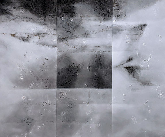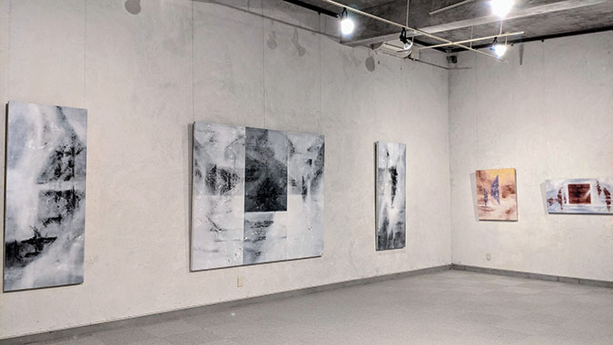 存在と題された展覧会ですべての作品の題は「存在」。ダイナミックで動く風を感じさせることも特徴だ。同じ題なので説明に困るが、モノクロの作品群は台風の時の雲の動きといったらいいのだろうか、すべてが、めくるめく動きとどまることがない。枯れた葉、砂が地面を舞い意図しない図柄を地面に表しながら形を変えていく。抽象ながら、うつろいゆく姿は時間の経過を表しているのかもしれない。抽象でありながら具象、具象でありながら抽象。