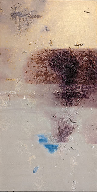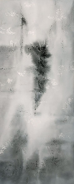 しかし最近の作品は、またさらに変わって、光を感じさせる空間そのものになり、さらに抽象性を増した。表面には枯葉、砂などがコラージュされ画材の一部として使われている。それはまた、パリの人が行きかう石の道を思わせる。一方、最近作は墨を使い、日本回帰ともいえるものもある。