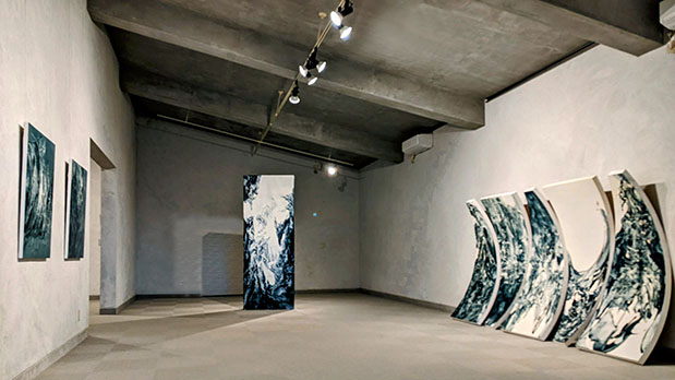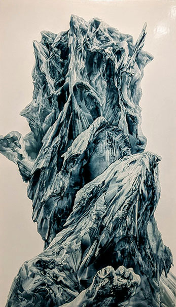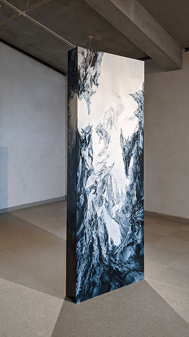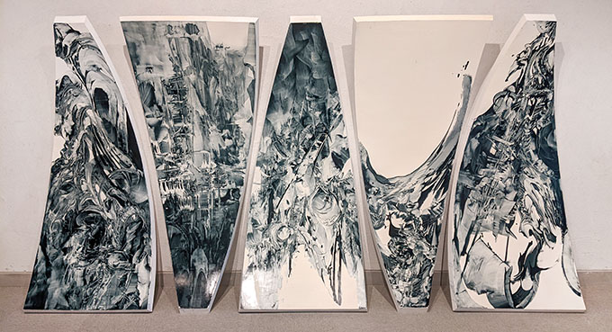 まずは「後未來興亡図」、彫像のモノリスを思わせる高さ約2.4mの作品は、絵画やオブジェなどという人間の概念を超越して起立している。さらにそこに描かれたものは、かつての水墨画の山水画、例えば雪舟の「四季山水図」のようでもあり、ミケランジェロの天地創造のようでもあり、見方によっては最新のCGを使ったアニメーションのようでもある。しかしそこに描かれているは、植物でも岩でもない。そういう意味の具体物はないがリアリティーがある。まさに新たな仮想現実の世界。宇宙からきて人類の前に突然姿を現した謎の物体を見て、人々は、これはいったいなん何なのだ、何が描かれているのだ、と騒ぐ。これを見て何かが起こりそうな予感。作者はそうした物を作りたかったのだろうか。これは見る人に評価を迫ると同時に、人を選ぶ作品でもある。もしかしたら従来の目からは受け入れられないのかもしれない。多少飛躍するが、戦前、坂田一男がパリのマシンエイジ(機械の時代)の絵を描いて日本の美術評論家に受け入れらなかったように。