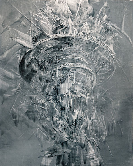 次の平面作品の「不在の実在」、「未來遺構」は前者に比べれば従来の美術作品の延長にみえる。しかしそれらは回転したりうごめいていたり、機械的なような、生物的なような不思議な絵画。よく見ると絵画という物体ではなく突然目の前に現れた光景なのかもしれない。その一瞬を高速度カメラで撮影したようなイメージ。これも見ているとこれは何かと勝手に脳が解釈を始める。そして脳の記憶からその絵を解読しようとするのだが、それはまったく意味のないことかもしれない。これも別の意味で人の評価を拒む。こういう絵がこの世にある、と知るだけで良いのだ。