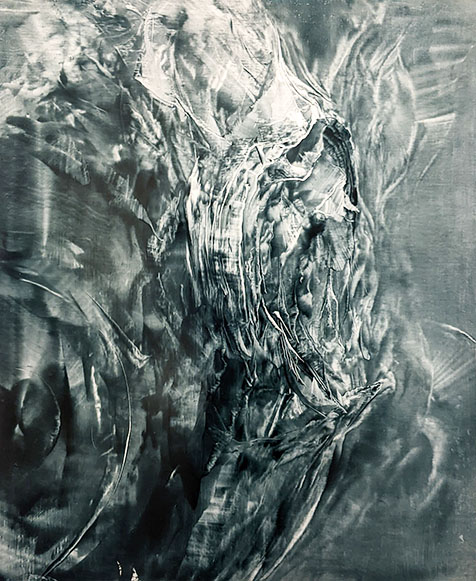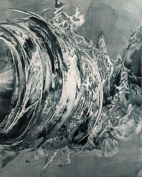 そもそも藤森氏の作品に特徴的なのは、油絵具をゴムベラでスクラッチする技法。以前にも油絵の具のパレットナイフで絵を描く技法はあった。たとえばゲルハルト・リヒター。濃淡だけ、は当館で展覧会をした津川純子氏がいる。しかし恐らく両者はお互いにその作品を知らない。濃淡というかグラデーションは絵画表現の肝であるように思う。水墨画、水彩画では水で濃淡を表す事が出来る。日本のかつての木版版画の濃淡の表現は息をのむ。キュビズムでは、セザンヌ、ピカソ、レジェいずれも不器用ながら濃淡に挑戦した。藤森氏の作品で特徴的なのはその諧調がスムーズで無限な事だ。そして比類ないほどダイナミックで切れが良い。今回の作品はさらに職人技といえるまでの物となった。当館にとってもこうした新しい手法の作品を展示できることはうれしい限りだ。今回の展覧会が今後の作者の転機になることを願う。