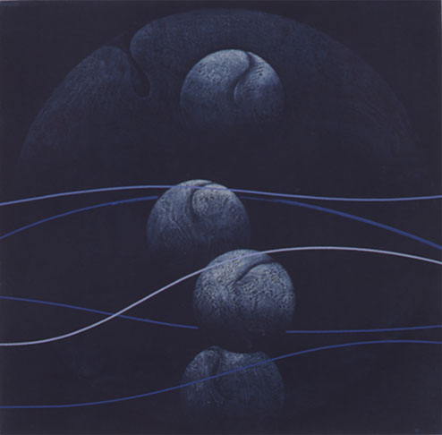 左側の作品「With quiet movement-8903」は、やはり矩形を三層に重ねつつ、縦に並んだ三つのテニスボールが印象深く、その間をスルリスルリと縫うように走るストリングが実に人間の〈関係性〉を象徴させているような感覚……。ボールは丸いのに、切り取ったような鋭さがあり、しかしさらに近づくと、その表面はざらつきが刻印されている(あたかも遠くからは丸い月が、その表面には数多のクレーターが過去の経過を物語っているように)。