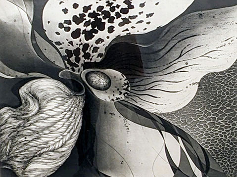 北野氏が住まわれている飯田市は自然豊かな町だが、氏の作品は信州というより都会を感じさせるところが不思議である。今回、展示室には精緻な銅版画の原板と様々な制作に使われる道具が展示されたが版画はやはり勤勉な人向きだ、と感じさせる。展覧会の題名は「信州からのメッセージ」であるが、ローカルという印象はあまりない。信州の人は進取の気性と勤勉性が特徴なのか、池田満寿夫は長野市育ち、草間彌生は松本市生まれで二人とも海外に目を向け渡る。北野氏も長年にわたり様々な版画の国際交流展に参加し、さらに国内での国際展の開催に関わられてこられた。弟子たちも師をならい多くの国際展に入賞、受賞されるなど活躍されている。