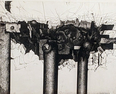この作者の抽象版画にも惹かれた。三本の柱、シリンダーのようなものの先は、朽ち破壊された壁、しかしそれがなぜか、金属の棒先に咲いた黒い花のように美しい。また切断された三つの横円柱が縦に並んだ作品、その立体感の輝きも美しいが、さらに一見端正なそれらが、近づくと表面にざらつきの模様が見えたり……これは北野作品のボールをある意味踏襲しつつ、円柱に置き換えるオリジナリティーと言える気がする。さらに、三つは三人の兄弟や友人を、シチュエーションを、さらに過去の記憶……などへと連想を促してくるようだ。