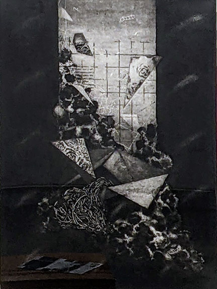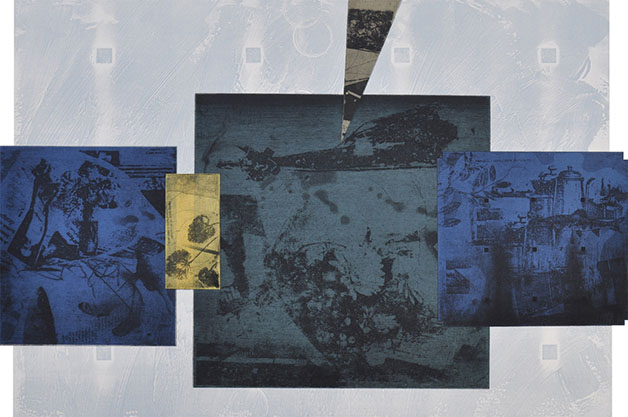 北野 (順不同)」。一方、日本は島国であり極東の国というハンデキャップが昔から存在し、日本の美術界は世界とは少し別の世界で生きてきた。しかし版画は簡単に輸送できるため国際的な交流が比較的に容易であり、特にヨーロッパとの交流も活発だ。一方、版画の制作にはプレス機など機材が必要で個人では負担が大きい。さらに技術的な協力体制だけでなく指導者が必要となる。アメリカやパリでも工房が主体的な活動をする例がある。北野氏の作品は様々な版画の技術を駆使した教科書ともいえるもの。今回の作品は、大判のサイズやコラージュが展示され、さらに鉛の箔摺りという手法やモノタイプもある。参加者のおおまかな印象として、メカニックで精緻な抽象の尾曽美和子氏、小島敬介氏、緻密な光景を描く柄澤博章氏、スピリチュアルで情緒的な樋口典子氏、大胆な構図で植物の形態に魅せられた梅田蓉子氏、素朴な自然志向の波岸祥子氏、波岸康幸氏、身近な生活風景に目を向ける安藤睦子氏と多士済々。北野氏の作品は版画だけではないようで、まさに版画の本場である信州からのメッセージであった。