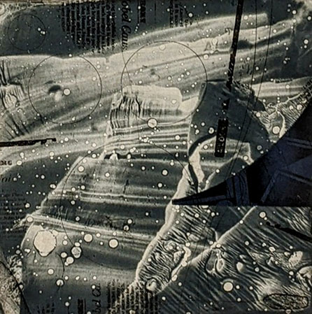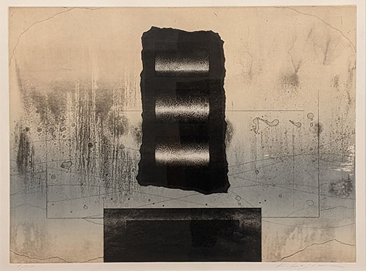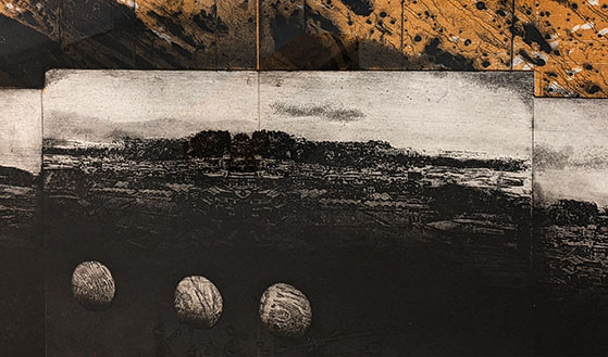 まず、奥の正面、聖なる壁に、堂々と三作が飾られていた。版画としては大きくかつ鮮烈だ。幾つもの賞を取られたという右の作品「A view-9303」は、信濃の山並みが遠くに見え、版の下地は何か木造校舎の壁、床を連想させる……抽象作品とはいえ、作者の成育した故郷、そして学業時代を連想させるような〈雰囲気〉がある。成績もよく品行方正、ある意味〈優等生〉であったのでは――そしてテニス部だったのだろうか、ボール三個ずつの並びが二列、画面は思い出の写真を重ねたように三層になっている。ただ、その中に実は波乱もあったのだと、飛沫のような波紋が見え、それは時の中に消化されつつも、感情の迸りのような背景の黄土色(赤ではなくセピア色的?)に込められているかのよう。過去の思い・情熱を技法と矩形の枠組みに収め提示する作者の姿勢がそんなことを連想させる。